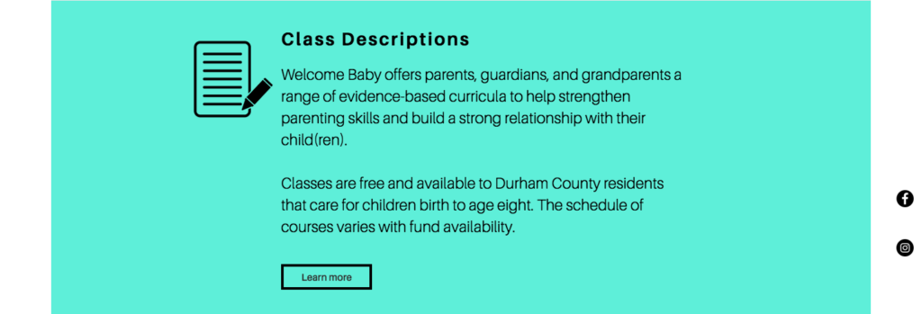 In the spring 2019 semester, I had the honor of working for Welcome Baby, a nonprofit organization in Durham, NC. Welcome Baby’s mission is to strengthen families with young children ages 0-5 by providing accurate child development information and emotional and practical support to Durham County families. Below you will find my communication audit, a fact sheet about Welcome Baby’s programs and services, a profile of a Welcome Baby employee and the website that my team and I created.